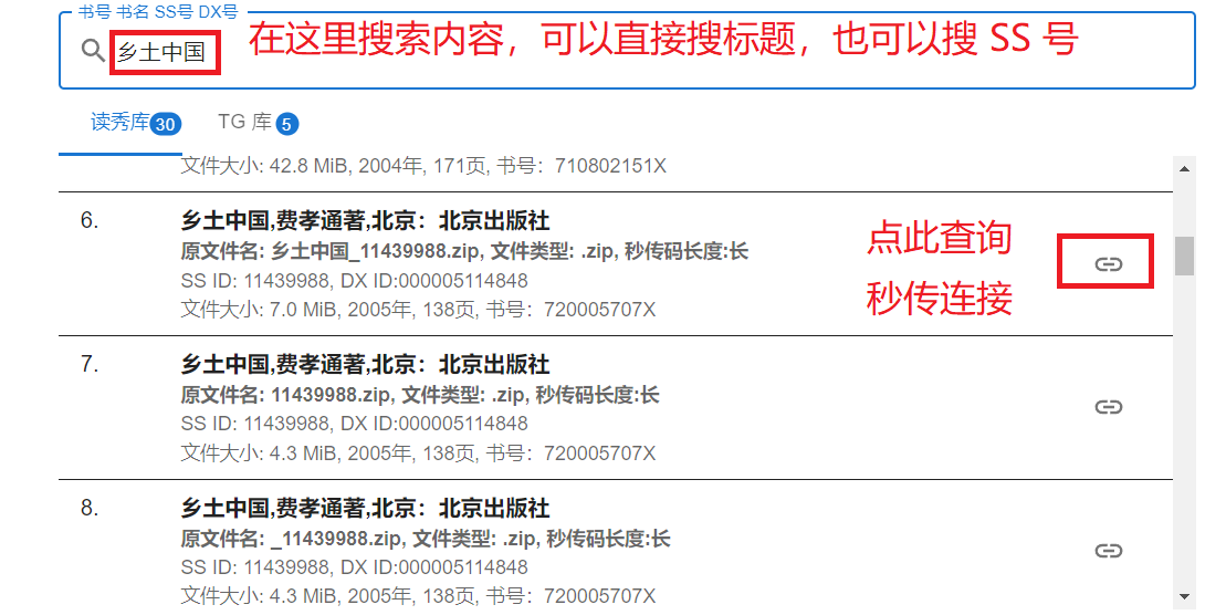 如图所示,直接搜索即可。支持搜索文件名/SS号/读秀号。由于这个结果是纯文本的,没有封面图,很多信息也不全,所以推荐先在其他平台/官网寻找好书籍、匹配好 SS 号之后,再使用这个网站精确定位下载。可以查询 SS 号的接口一览。