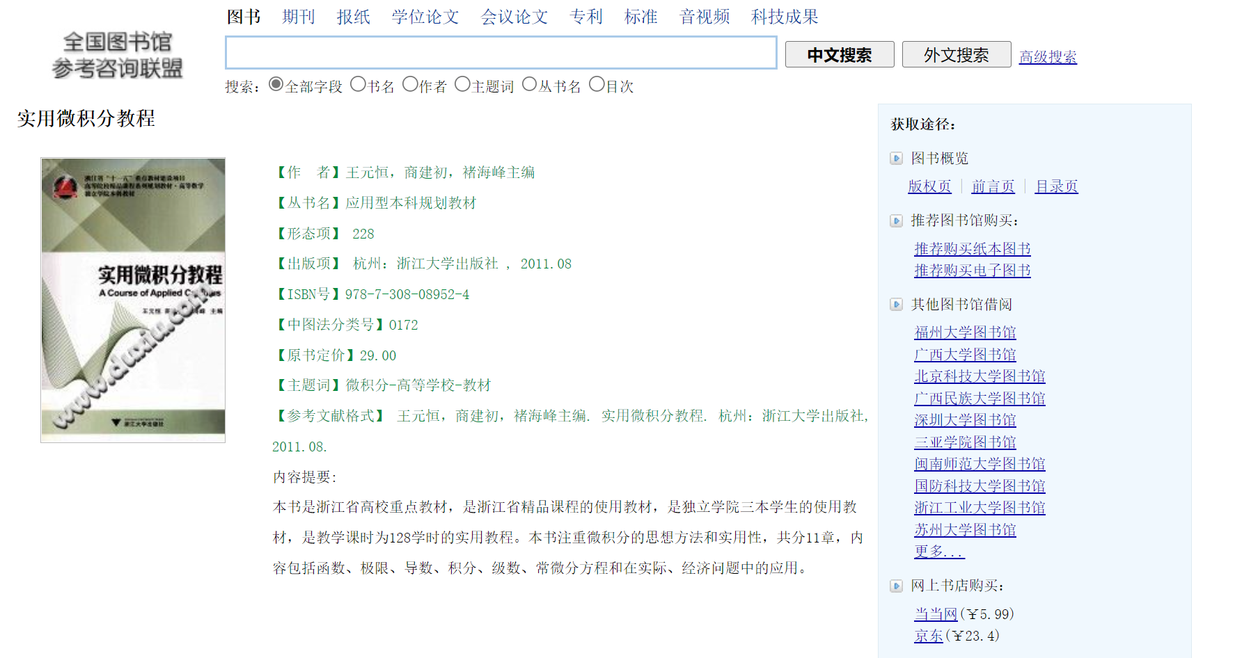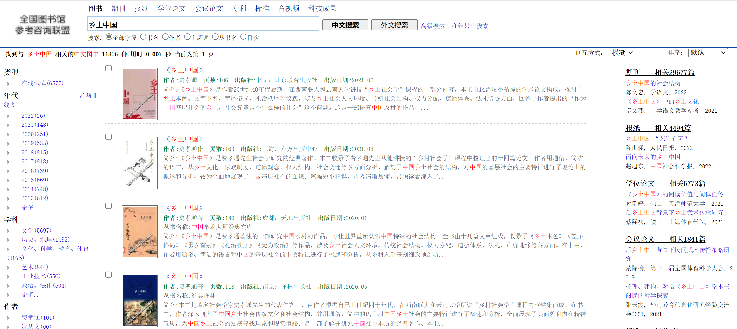 输入关键词,点击中文搜索。可以看到相关结果。除了图书外,还有期刊论文等数据,非常方便。