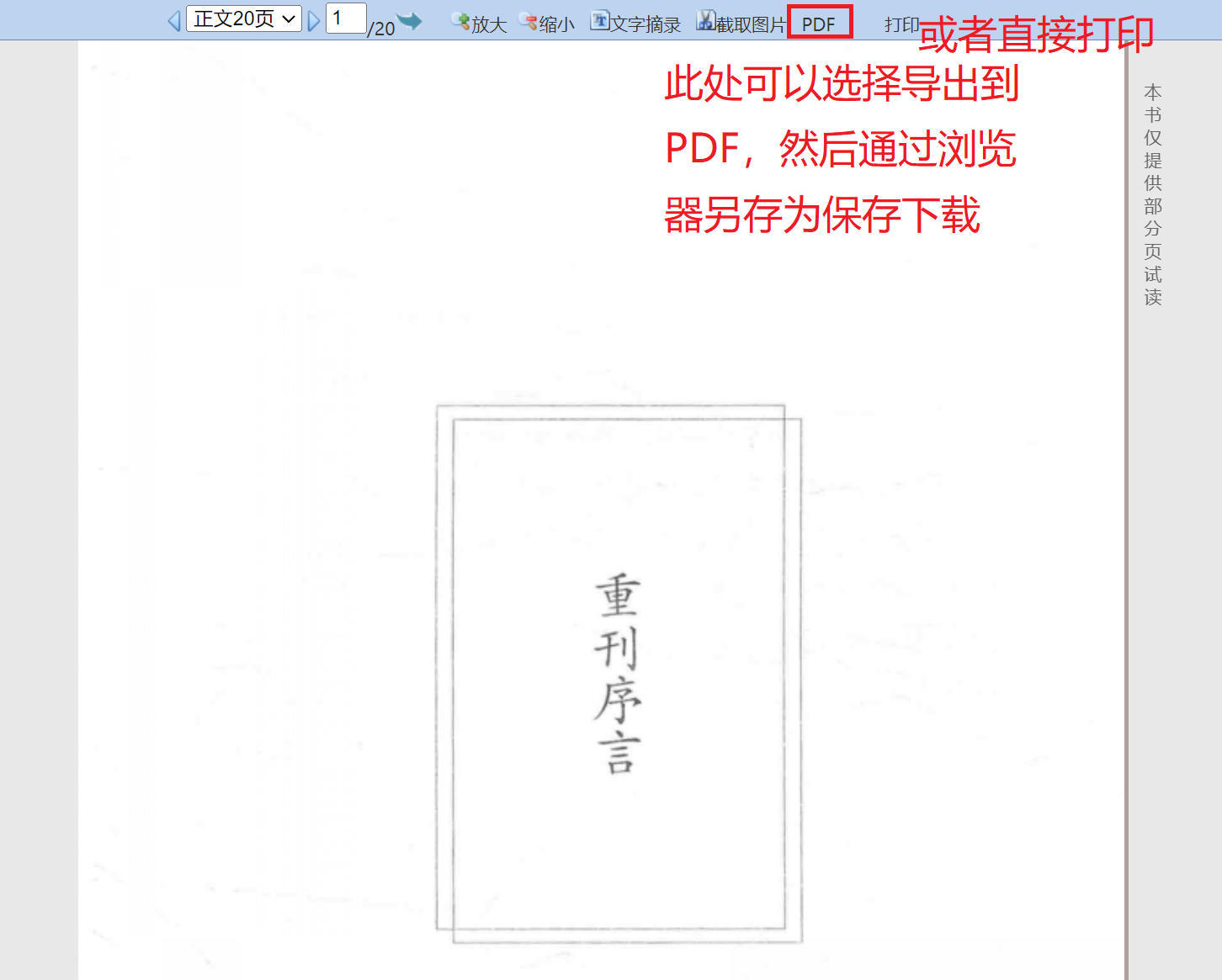 任意选择一本书,可以在右侧选择试读,试读一般只能读正文的前几页或者几十页,一般是按照全文页数以一定比例计算出来的。